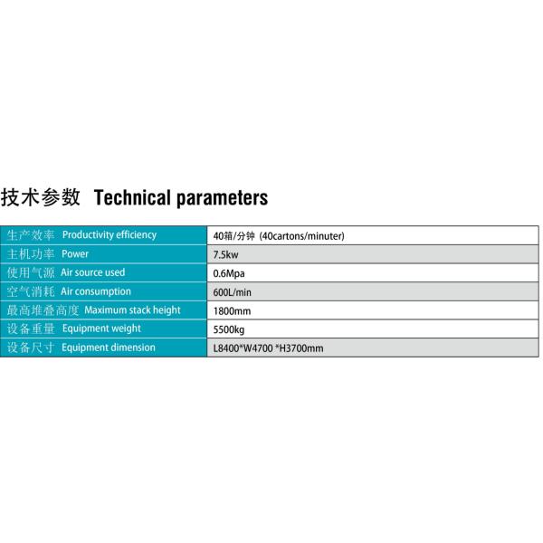 Structural framework for the welding way, strong and durable and has adjustable base functions, the main lifting platform uses the SEW motor drive, entry speed conveyor belt to separate into the box, entry expedite conveyor belt to separate into the box to separation,the stack area roller conveyor,2.5m chain conveyor output,free roller conveyor,use the safety protection device,uses Germany Siemens PLC control system, main-machine interface, portable fault automatic display.